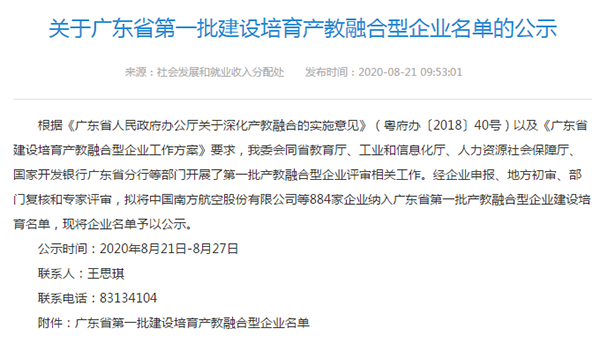 2020年8月21日,由广东省发展和改革委员会发布《关于广东省第一批建设培育产教融合型企业名单的公示》,本次建设培育产教融合型企业公示名单包括中国南方航空股份有限公司、中国电信股份有限公司广东分公司、广东电网有限责任公司等。