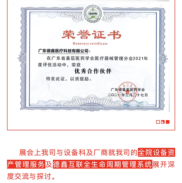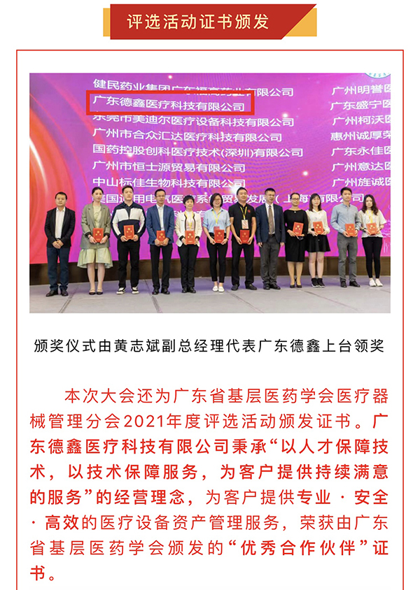 【新里程新突破新高度】广东德A医疗科技有限公司荣获由广东省基层医药学会颁发的“优秀合作伙伴”荣誉证书